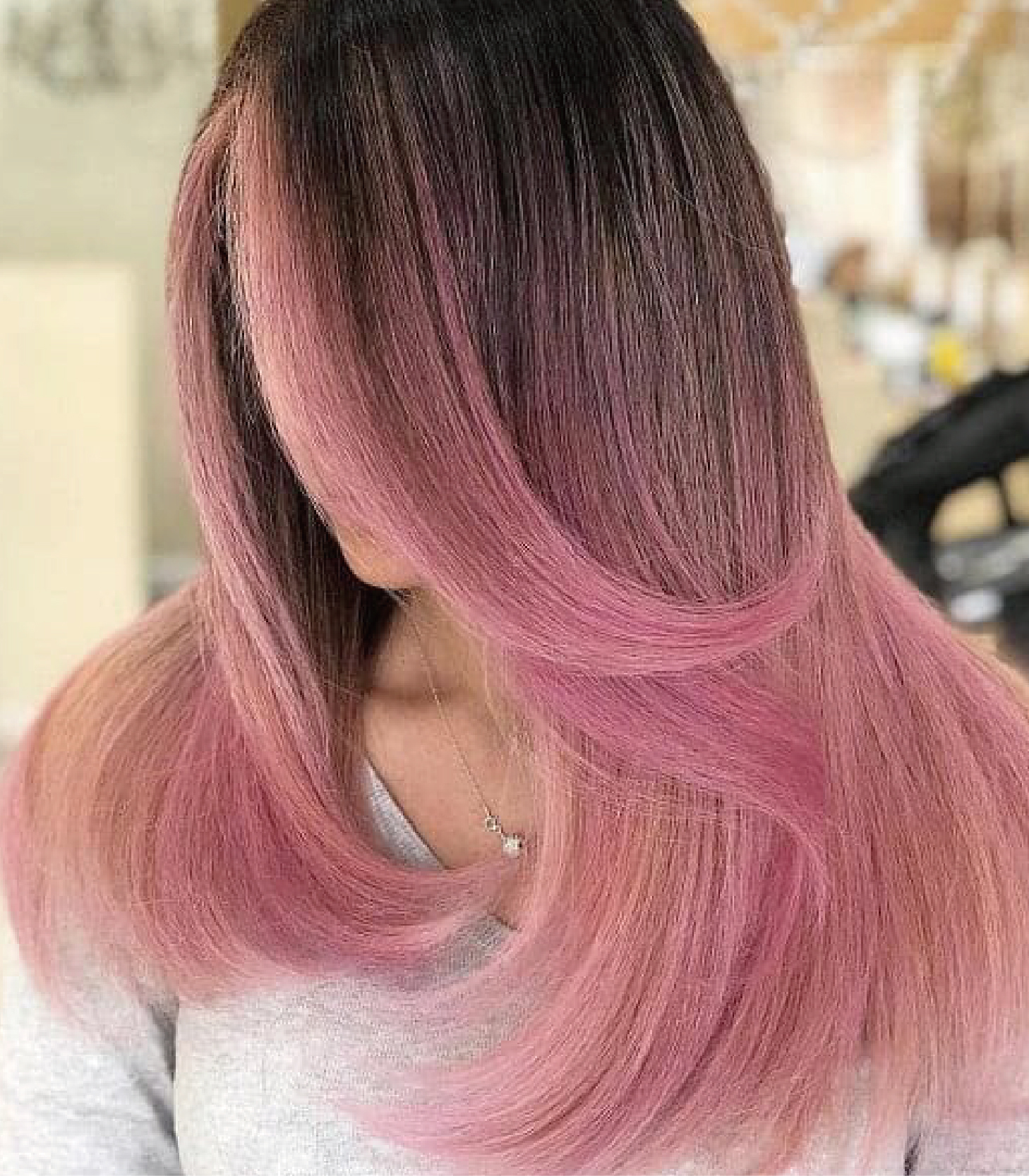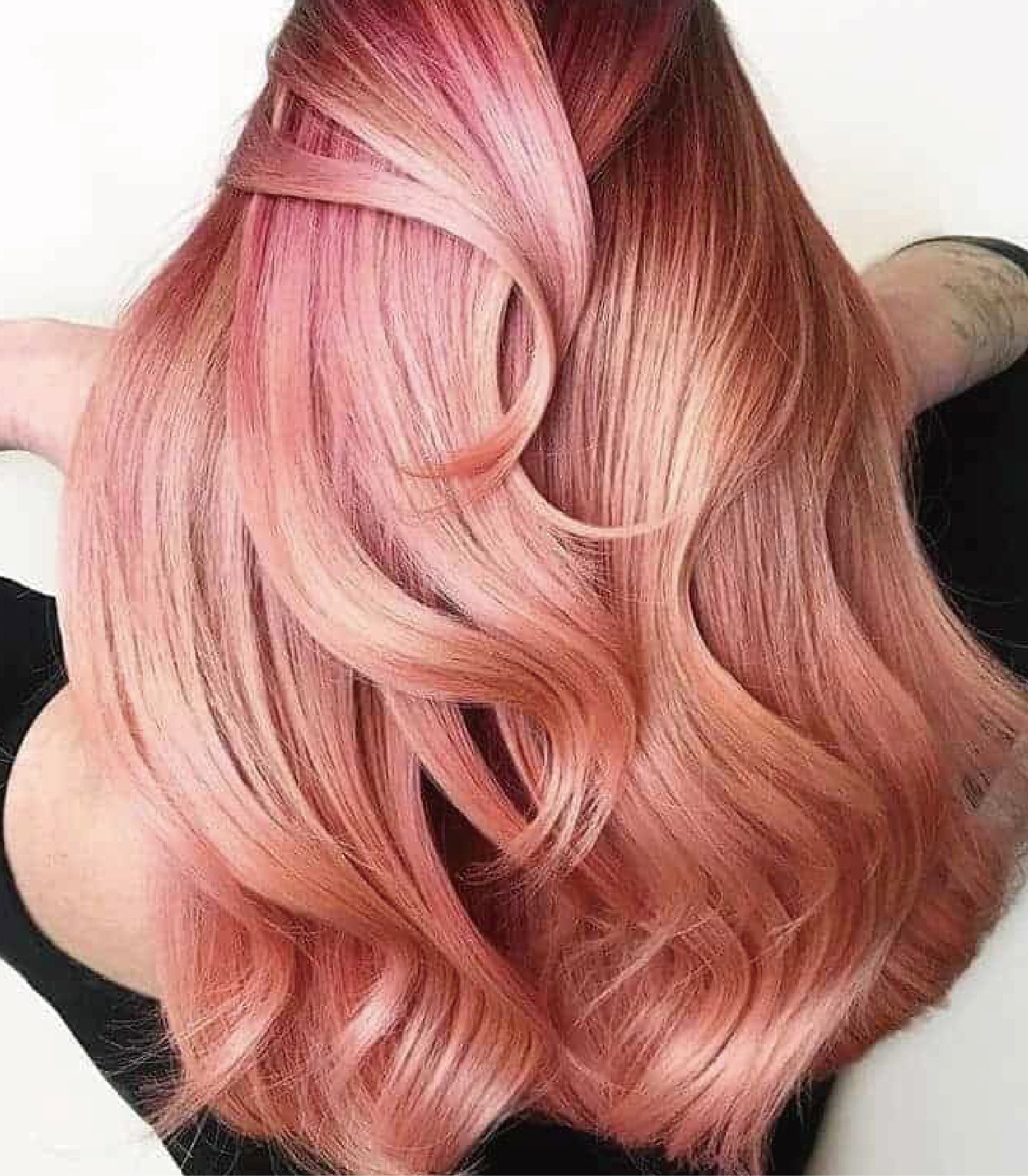 全粉紅色的漸變色髮型看起來很很漂亮。與其將髮根留在自然的原始頭髮中,不如將其染成深粉色。其餘的頭髮維持淺的粉紅色。